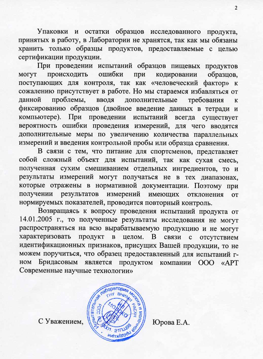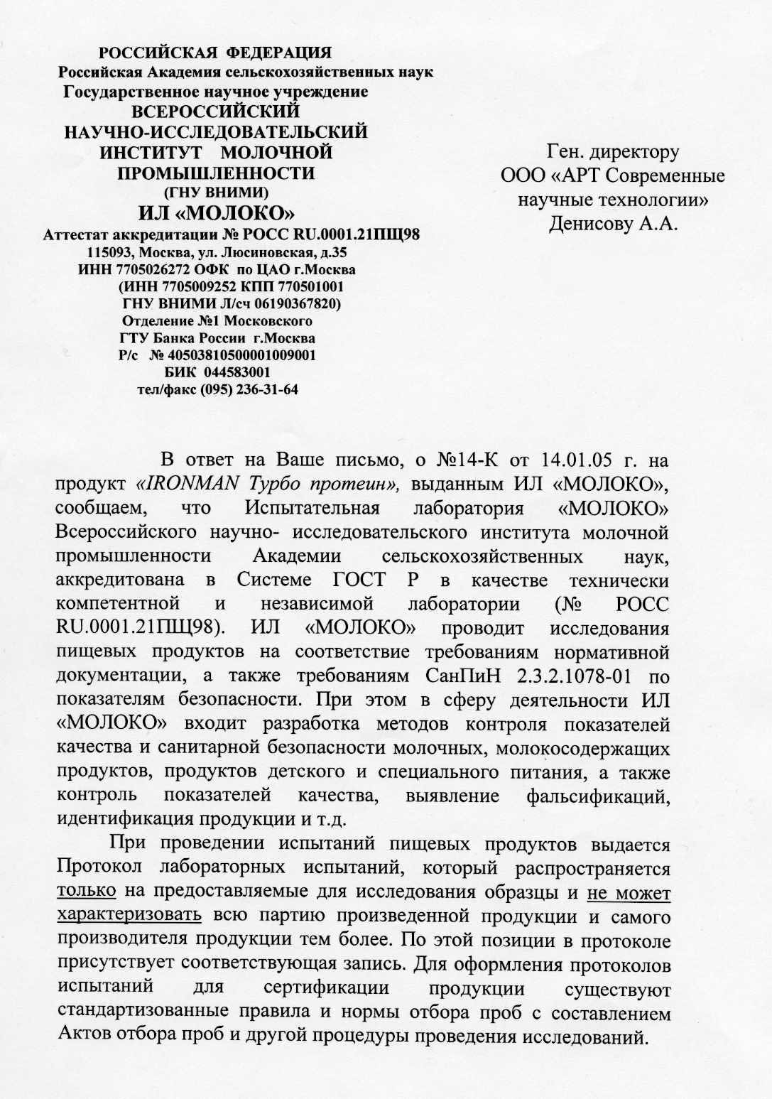 Об анализе продукта Ironman Турбо Масс в лаборатории института "Молоко"